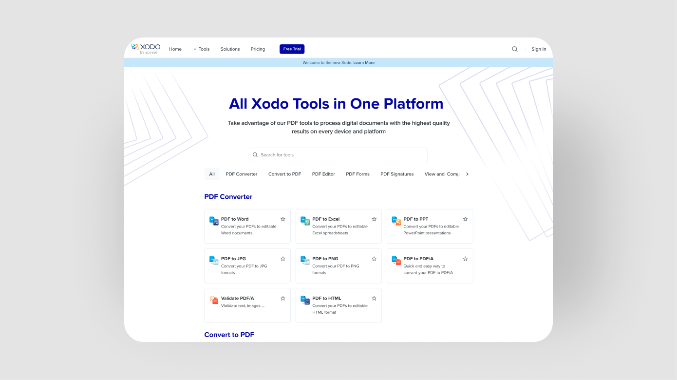 This project resulted in a complete refresh of Xodo's homepage, designed to improve usability, increase tool discoverability, and support the new Apryse brand identity. The redesign introduced features like a tool favoriting system, global search, and a more modern navigation model (laying the groundwork for a more scalable and intuitive product).